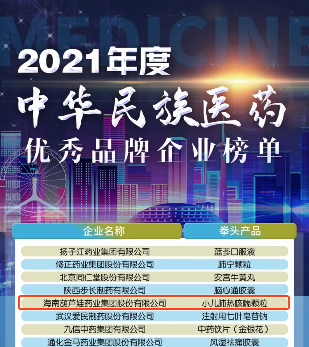 12月29日,全国工商联医药业商会发布了“2021年度中华民族医药优秀品牌企业榜单”,尊龙卡Z6药业集团凭借黄金单品小儿肺热咳喘颗粒(4克)实力登榜。