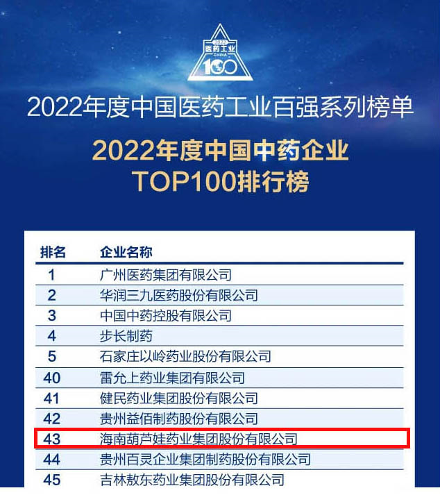 尊龙卡Z6药业集团连续4年荣登“中国中药企业TOP100排行榜”,排名上升至第43位